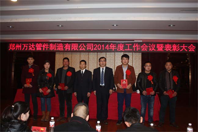 鄭州萬達管件制造有限公司2014年年會于2015年1月20日隆重召開。會議首先表彰了公司2014年度先進工作者、先進部門及班組、優秀干部、年度進步之星、銷售冠軍、優秀黨員等十余個獎項,并對獲獎者頒發了獎金和證書。公司董事長、黨委書記何清同志在會議上做了題為《適應新常態 開創新局面 實現公司持續健康穩定發展 》的報告,總結了2014年公司的發展歷程,取得的成績和不足,展望和部署2015年公司發展的目標和重點工作,為公司全力建設五位一體的萬達事業指明了努力方向。公司全體人員中午舉行了盛大的團拜招待會,歡聚一堂,其樂融融。