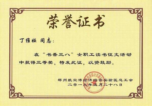 5月28日,鄭州航空港經濟綜合試驗區總工會下發表彰通知,在全區女職工中開展的“逐夢新時代·巾幗綻芳華”為主題的“書香三八”女職工讀書征文活動中,我公司員工丁維婭的作品獲得三等獎,并下發榮譽證書及鄭州市新華書店購書卡以資鼓勵。