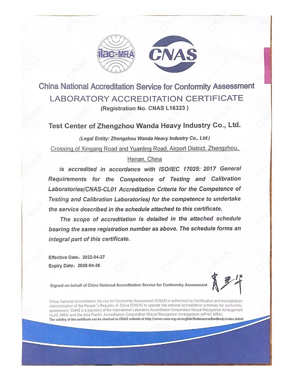 近日,鄭州萬達重工股份有限公司檢測中心順利通過中國合格評定國家認可委員會(以下簡稱CNAS)的審核,并獲得CNAS實驗室認可證書(注冊號L16323),這標志著萬達重工在實驗室建設、試驗及檢測能力和質量保障等方面取得了新的成果,代表著公司的技術能力和管理水平具備國際水準的規范性和公信力,提升了品牌影響力和企業的核心競爭力。