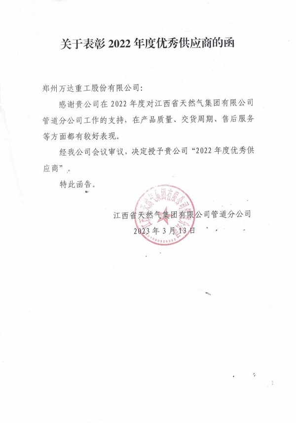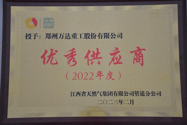 近日,鄭州萬達(dá)重工股份有限公司收到了江西省天然氣集團(tuán)有限公司管道分公司頒發(fā)的2022年度“優(yōu)秀供應(yīng)商”榮譽(yù)獎牌,獲得該公司2022年度優(yōu)秀供應(yīng)商榮譽(yù)稱號。業(yè)主方對公司所承接彎管項目的產(chǎn)品質(zhì)量、交貨周期、售后服務(wù)等方面給予高度贊揚(yáng)。
