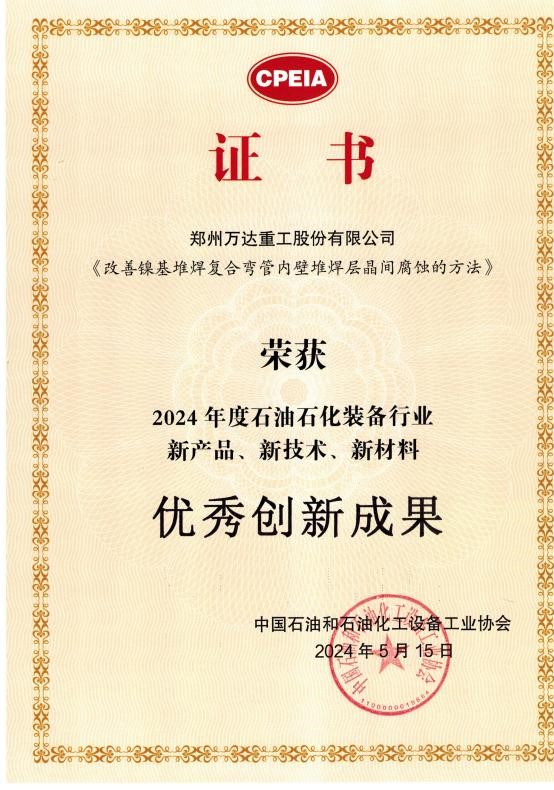 為進一步推廣和宣傳公司技術創新成果,更好的為開拓市場助力,持續提升企業核心競爭力,根據中國石油和石油化工設備工業協會發布的《關于征集石油石化裝備行業“2024年度新產品、新技術、新材料”科技創新成果的通知》要求,經過企業自愿申報、行業專家審查初選、終選與展示等環節,萬達重工自主研發的 “改善鎳基堆焊復合彎管內壁堆焊層晶間腐蝕的方法”技術成果被評選為2024年度中國石油石化行業“優秀創新成果”,與中石油、中石化、中海油、寶雞石油、南陽二機、西安陜鼓等多家行業優秀企業的創新產品和技術成果共同在“2024年第三屆石油石化裝備產業科技大會暨科技創新成果展覽會”上進行發布和推廣,公司品牌總監白楊參加會議并領取成果榮譽證書。