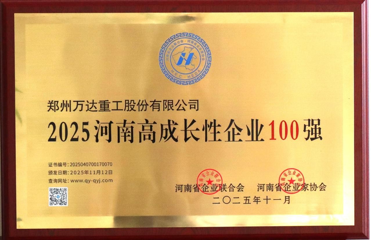 熱烈祝賀鄭州萬達重工股份有限公司連續榮獲2025河南省高成長性100強企業