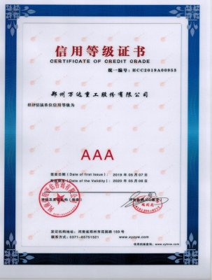 2019/05/07   744 2019年5月7日,河南信用評估咨詢有限公司簽發AAA主體信用等級證書授予鄭州萬達重工股份有限公司。在2019年的AAA主體信用評級中,鄭州萬達重工股份有限公司順利通過復審,榮獲AAA信用等級證書,保持了連續多年的AAA信用等級。 我國企業信用評估的信用等級采用國際通行的四等十級制評級等級,具體等級分為:AAA,AA,...